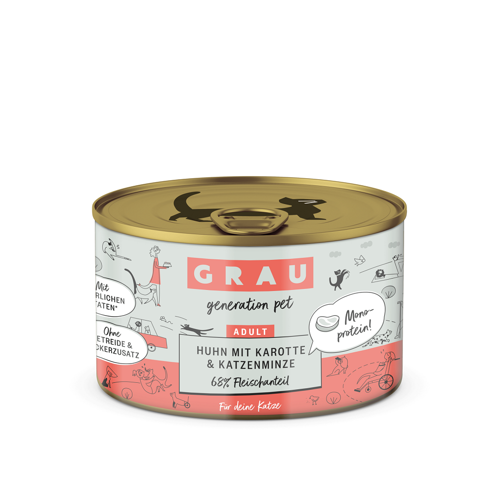 ΑΠΟΛΑΥΣΤΙΚΗ ΚΑΙ ΕΞΑΙΡΕΤΙΚΑ ΘΡΕΠΤΙΚΗ ΥΓΡΗ ΤΡΟΦΗ ΣΕ ΚΟΝΣΕΡΒΑ ΓΙΑ ΕΝΗΛΙΚΕΣ ΓΑΤΕΣ ΣΕ ΚΟΝΣΕΡΒΑ GRAU CATS CHICKEN, CARROTS, CATNIP ΜΕ 97% ΚΡΕΑΣ ΑΠΟ ΚΟΤΟΠΟΥΛΟ ΚΑΙ ΖΩΜΟ, ΚΑΡΟΤΑ ΚΑΙ ΔΥΟΣΜΟ, ΧΩΡΙΣ ΣΙΤΗΡΑ