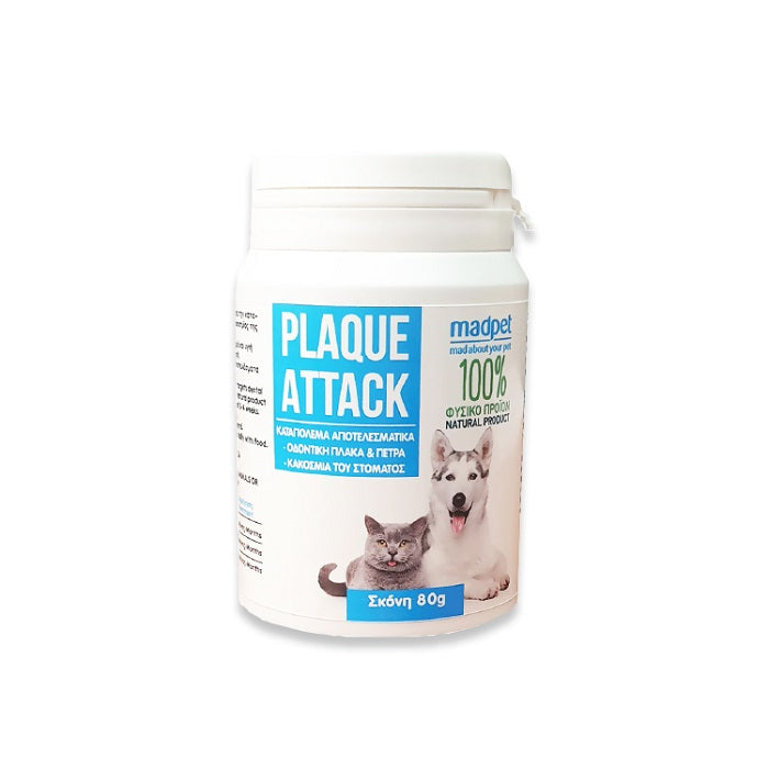 Το MADPET Plaque Attack έχει σχεδιαστεί για την καθημερινή φροντίδα της στοματικής κοιλότητας, καταπολεμά Οδοντική πλάκα, Πέτρα & Κακοσμία της αναπνοής σκύλου & γάτας. Με την ειδική του σύνθεση βοηθά να διατηρούνται καθαρά και υγιή τα δόντια και τα ούλα, καθώς προσφέρει & ευχάριστη αναπνοή. Αποτελείται απο 100% φυσική άλγη και τα αποτελέσματα του γίνονται ορατά εντός 3-4 εβδομάδων. Δεν περιέχει πρόσθετα, χρωστικές ή συντηρητικά. Χωρίς ζάχαρη ή γλουτένη.
