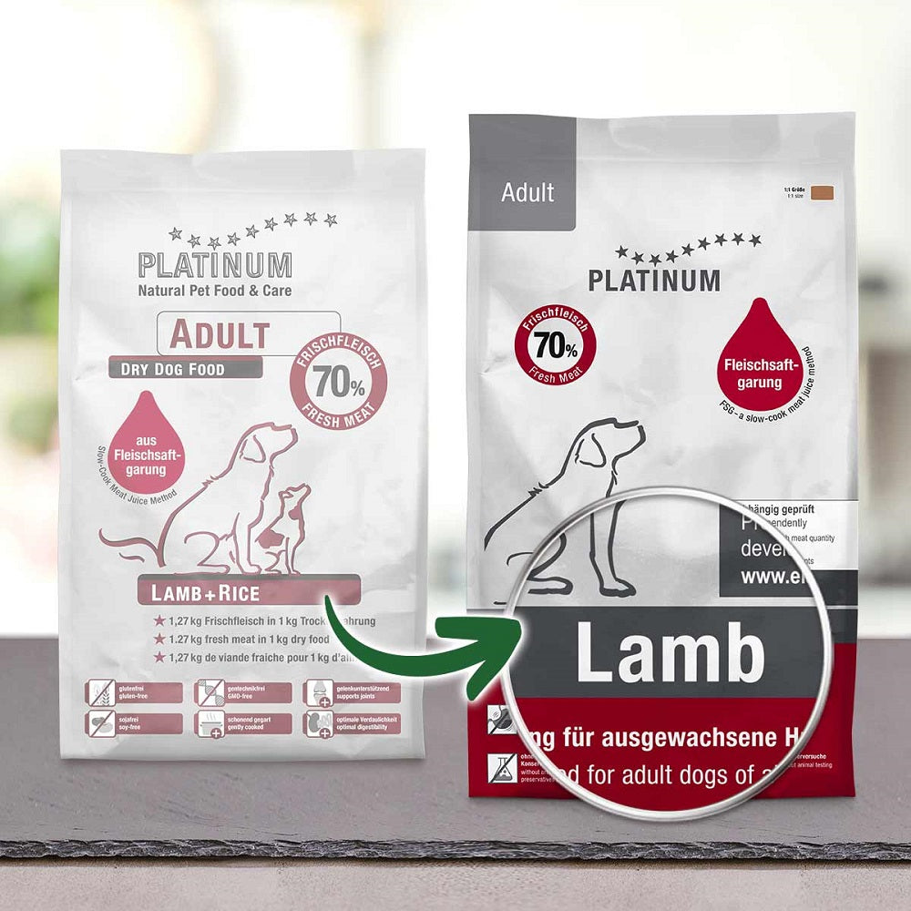 Το PLATINUM Adult Lamb+Rice περιέχει μόνο υψηλής ποιότητας συστατικά, τα οποία είναι επιτρεπόμενα ακόμα και για ανθρώπινη κατανάλωση: