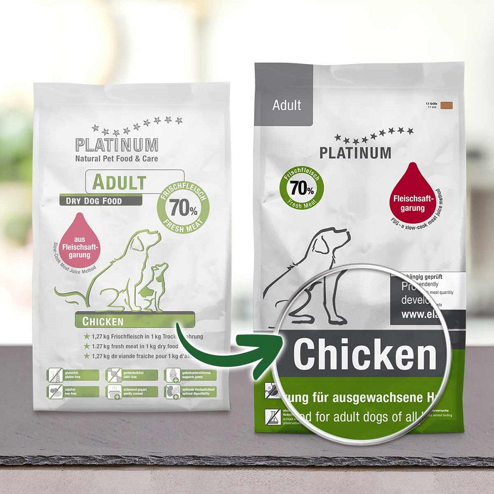 Η πλήρης τροφή για ενήλικα σκυλιά είναι κατάλληλη για σκυλιά κάθε ηλικίας ή ράτσας, χάρη στην φυσική, υγιεινή σύνθεση και την ευκολία με την οποία μπορεί να χωνευτεί. Απαλλαγμένη από ανεπιθύμητα πρόσθετα που καταπονούν τον οργανισμό. Το Adult Chicken της PLATINUM περιέχει μόνο υψηλής ποιότητας υλικά, τα οποία είναι επιτρεπόμενα ακόμα και για ανθρώπινη κατανάλωση: