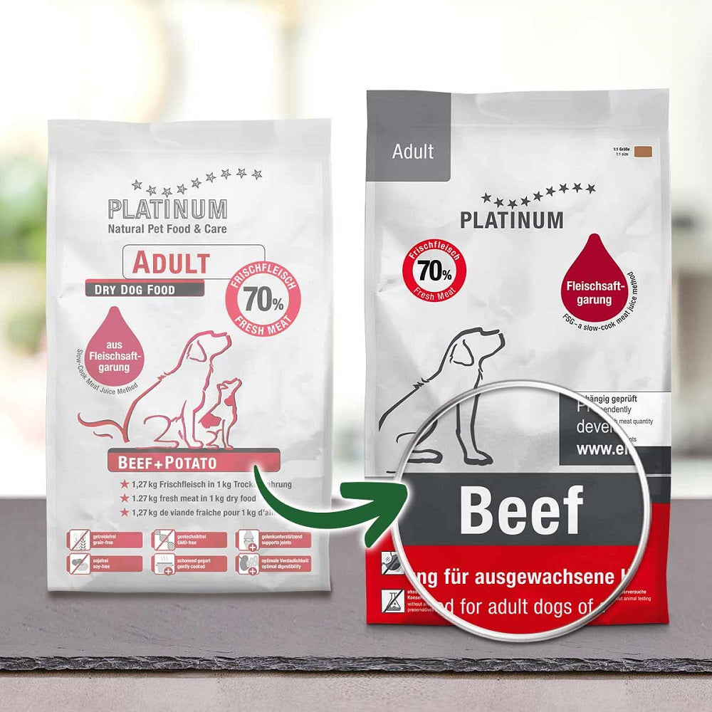 Το Adult Beef+Potato της PLATINUM περιέχει μόνο υψηλής ποιότητας υλικά, τα οποία είναι επιτρεπόμενα ακόμα και για ανθρώπινη κατανάλωση: