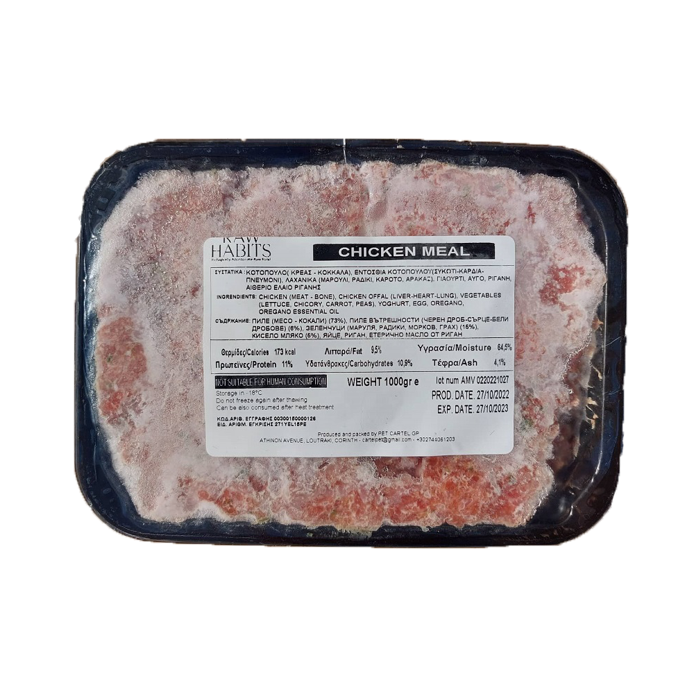 Η BARF τροφή Raw Habits Chicken Meal είναι ένα πλήρες γεύμα άριστης ποιότητας με βάση το φρέσκο κοτόπουλο Ελληνικής εκτροφής και την προσθήκη ολόφρεσκων λαχανικών, χωρίς καμία προσθήκη συντηρητικών και χρωστικών ουσιών, που αποφέρει θεαματικά αποτελέσματα στην υγεία και την ευζωία των σκύλων.